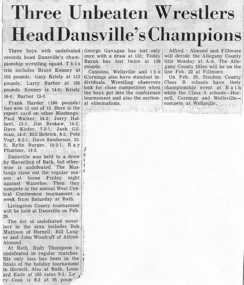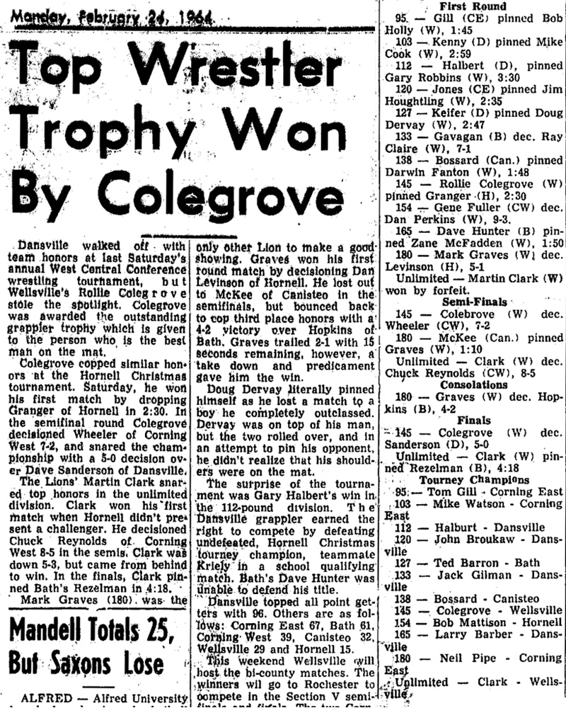 Rollin Colegrove (Wellsville) > Dave Sanderson (Dansville) decision 5-0