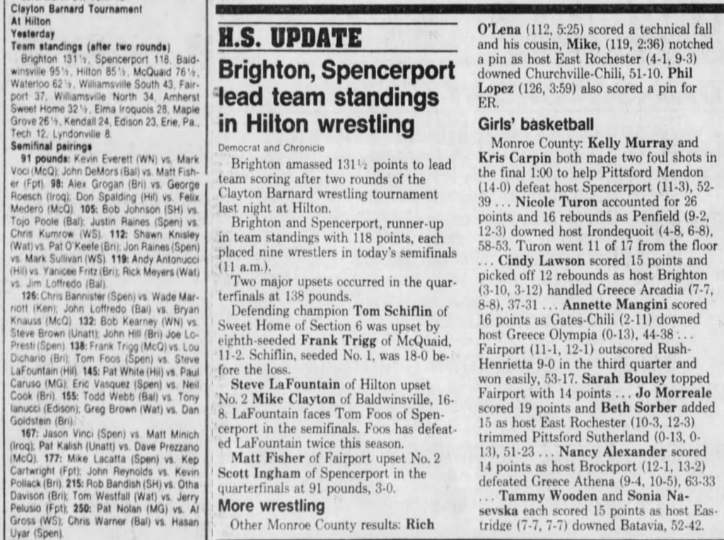 138 Tom Foos (Spencerport) > Frank Trigg (MQJ) decision 3-1