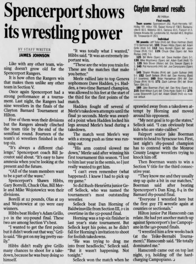 125 Bill Merle (Spencerport) > Dave Hadden (Geneva) decision 3-1