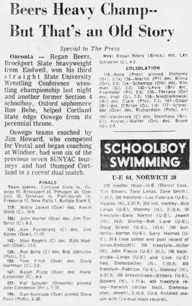 Ron Behe (Cortland) > Bob Johnston (Potsdam) decision 7-5
