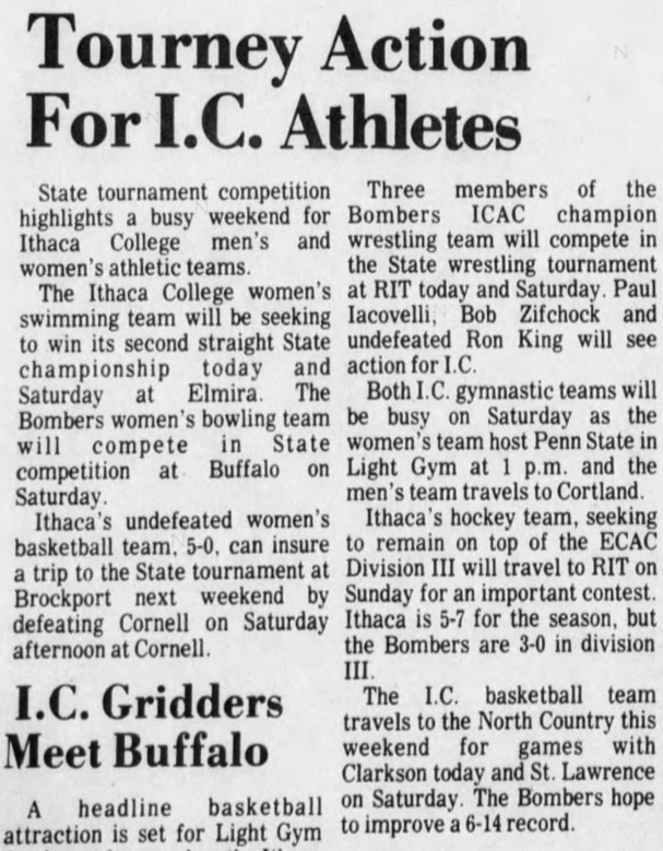University at Buffalo [NY] 162.5, SUNY Brockport [NY] 128.5, SUNY Oswego [NY] 76.5, Colgate University [NY] 62, Rochester Institute of Technology [NY] 58.5, SUNY Potsdam [NY] 58.5, University at Albany [NY] 36.5, Union College [NY] 22, SUNY Geneseo [NY] 21, Binghamton University [NY] 18.5, University of Rochester [NY] 17, SUNY Cortland [NY] 14.5, Buffalo State College [NY] 12.5, Ithaca College [NY] 11, Rensselaer Polytechnic Institute [NY] 6, St. John Fisher College [NY] 2, U.S. Merchant Marine Academy [NY] 2, SUNY Oneonta [NY] 1.5