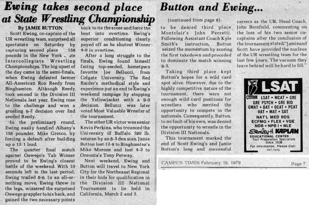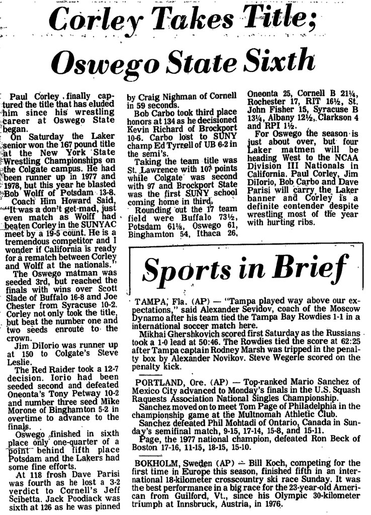 Paul Corley (Oswego) > Bob Wolff (Potsdam) decision 13-8