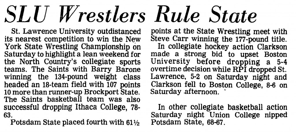 St. Lawrence University [NY] 107, Colgate University [NY] 97, SUNY Brockport [NY] 81.25, University at Buffalo [NY] 73.5, SUNY Potsdam [NY] 61.25, SUNY Oswego [NY] 61, Binghamton University [NY] 54.75, Ithaca College [NY] 26.75, SUNY Oneonta [NY] 25, Cornell University (B Team) [NY] 21.25, University of Rochester [NY] 17, Rochester Institute of Technology [NY] 16.5, St. John Fisher College [NY] 15, Syracuse University (B Team) [NY] 13.25, University at Albany [NY] 12.5, Clarkson College of Technology [NY] 4, Rensselaer Polytechnic Institute [NY] 1.5
