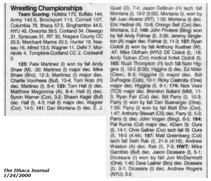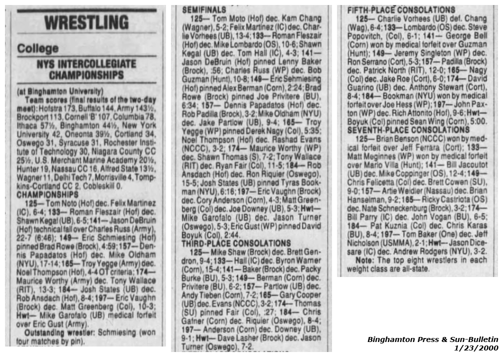 Brian Benson (NCCC) > Jeff Ferrara (Cortland) forfeit