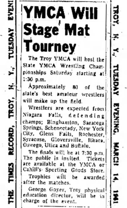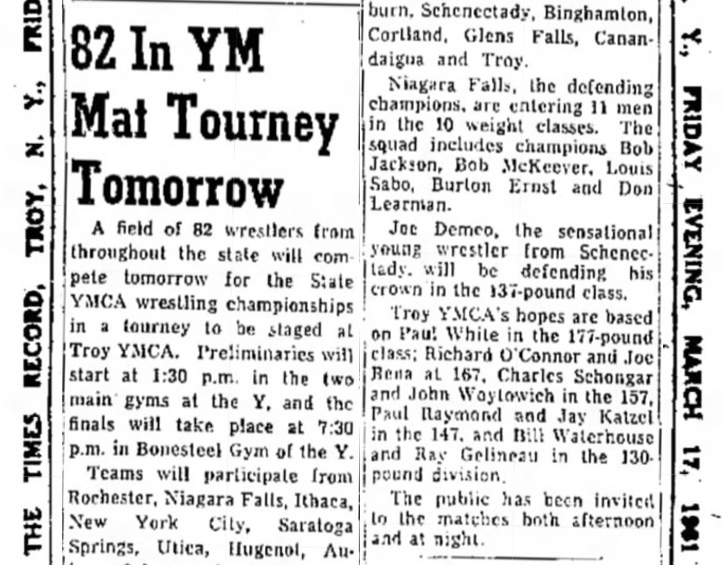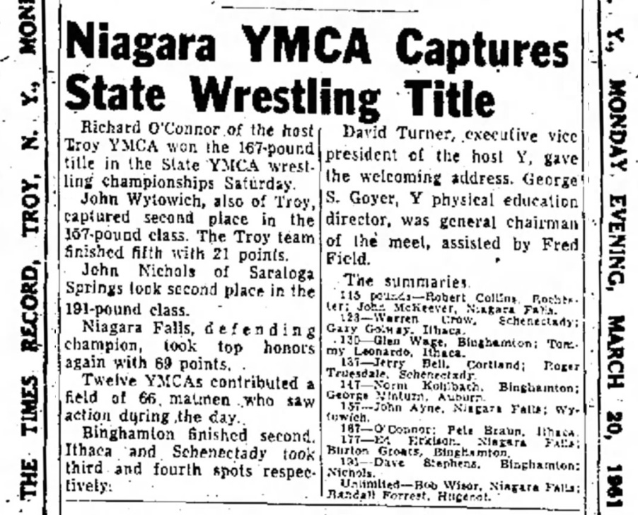Niagara Falls YMCA [NY] 69, Binghamton YMCA [NY] 50, Ithaca YMCA [NY] 40, Schenectady YMCA [NY] 30, Troy YMCA [NY] 21,