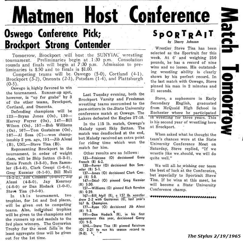 Steve Tisa (Brockport) > Carl Reistrom (Oswego) fall 2:21