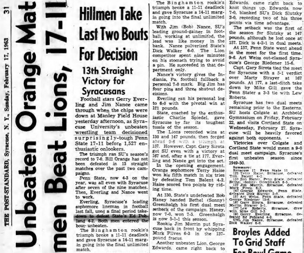 Jim Nance (SU) > Dick Walker (PSU) decision 6-0
