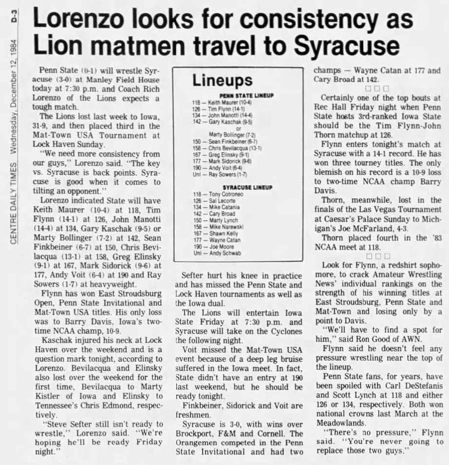 Marty Lynch (SU) > Sean Finkbeiner (PSU) major decision 9-0