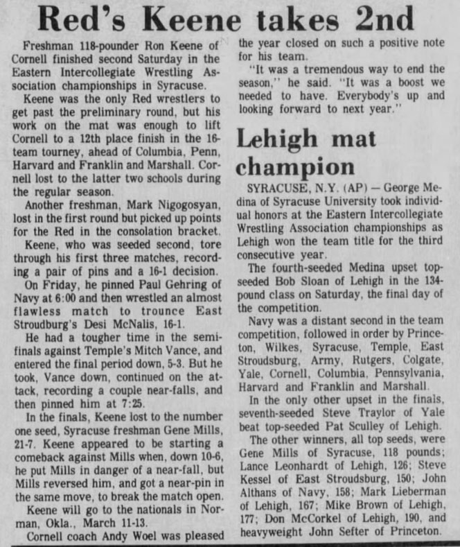 Lehigh University [PA] 155, U.S. Naval Academy [MD] 95, Princeton University [NJ] 86, Wilkes University [PA] 85, Syracuse University [NY] 73.5, Temple University [PA] 62.5, East Stroudsburg University [PA] 54.5, U.S. Military Academy [NY] 37.75, Rutgers University [NJ] 33.25, Colgate University [NY] 31, Yale University [CT] 30, Cornell University [NY] 18.25, Columbia University [NY] 14.5, University of Pennsylvania [PA] 14, Harvard University [MA] 6.5, Franklin & Marshall College [PA] 4.25