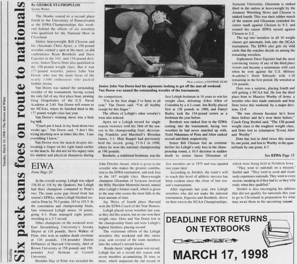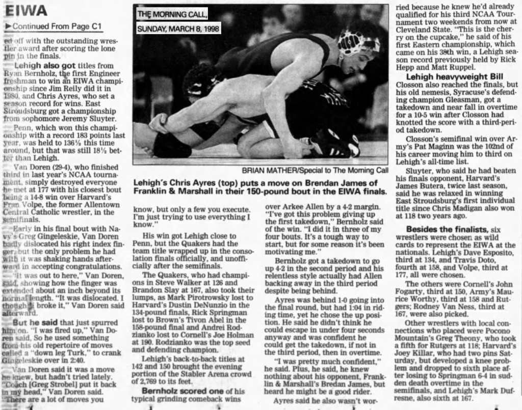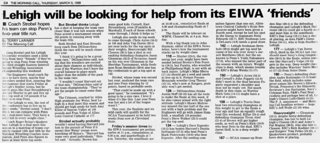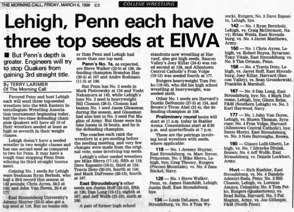 Jason Gleasman (SU) > Bill Closson (LU) decision 10-5 (1OT)