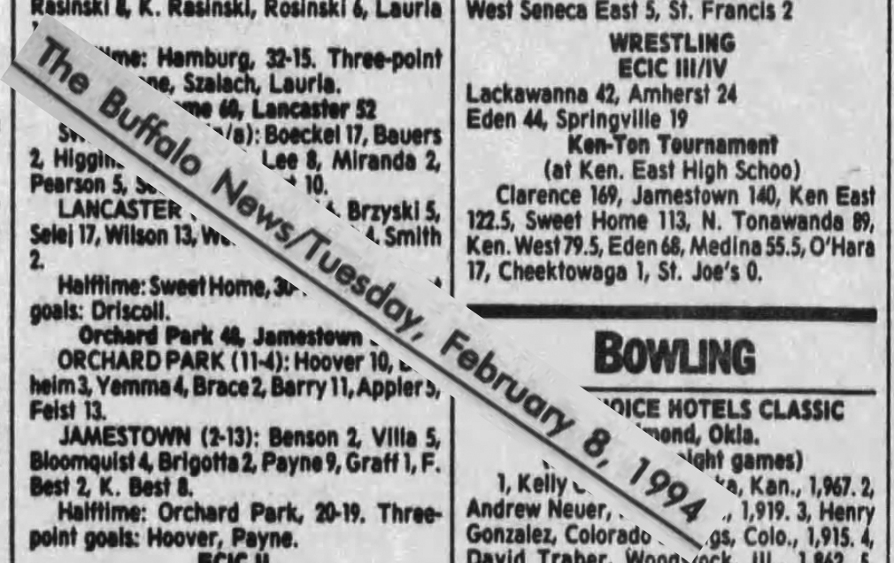Clarence [NY] 169, Jamestown [NY] 140, Kenmore East [NY] 122.5, Sweet Home [NY] 113, North Tonawanda [NY] 89, Kenmore West [NY] 79.5, Eden [NY] 68, Medina [NY] 55.5, Cardinal O'Hara [NY] 17, Cheektowaga [NY] 1,