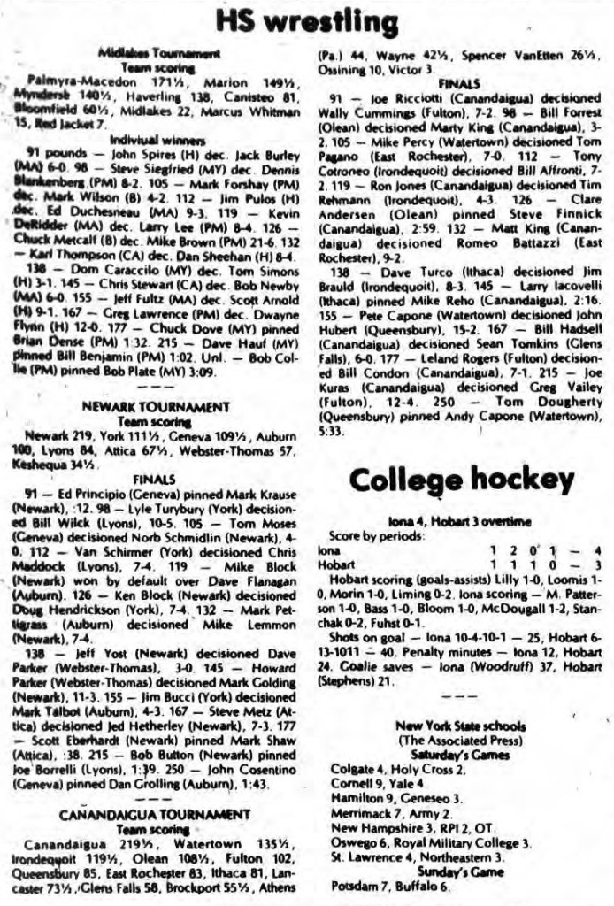 Canandaigua [NY] 219.5, Watertown [NY] 135.5, Irondequoit [NY] 119.5, Olean [NY] 108.5, Fulton [NY] 102, Queensbury [NY] 85, East Rochester [NY] 83.5, Ithaca [NY] 81, Lancaster [NY] 73, Glens Falls [NY] 58.5, Brockport [NY] 55.5, Athens [PA] 44, Wayne [NY] 42.5, Spencer-Van Etten [NY] 26.5, Ossining [NY] 10, Victor [NY] 3