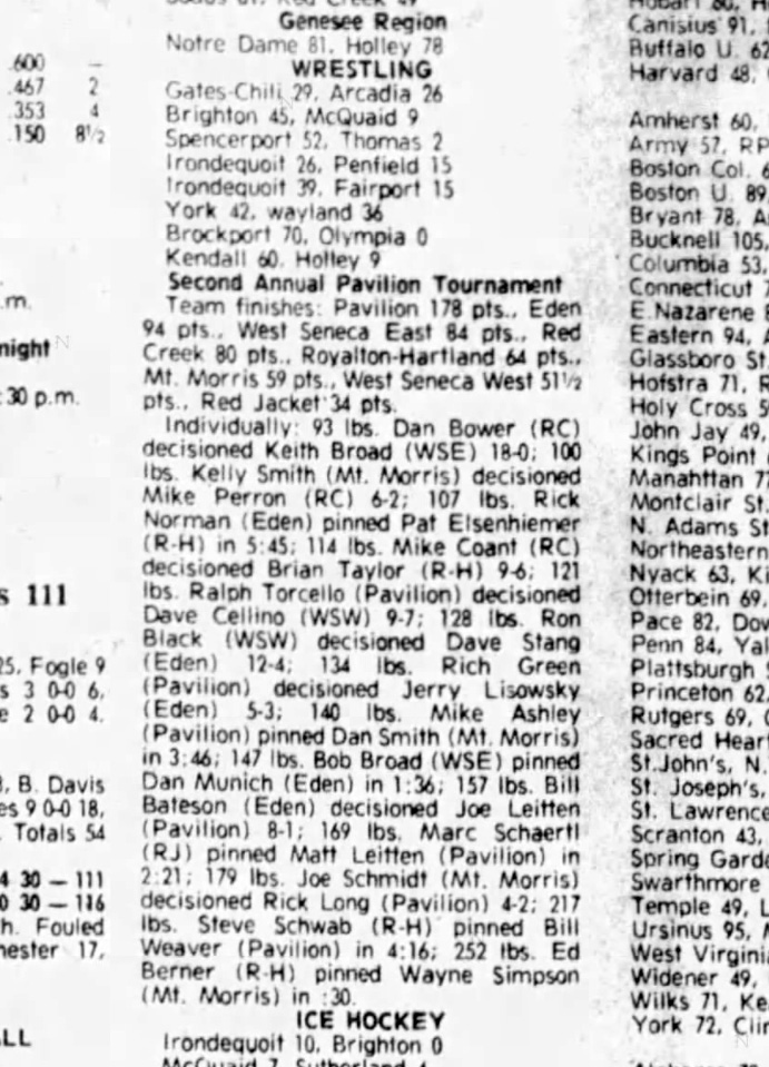 Pavilion [NY] 178, Eden [NY] 94, West Seneca East [NY] 84, Red Creek [NY] 80, Royalton-Hartland [NY] 64, Mt. Morris [NY] 59, West Seneca West [NY] 51.5, Red Jacket [NY] 34
