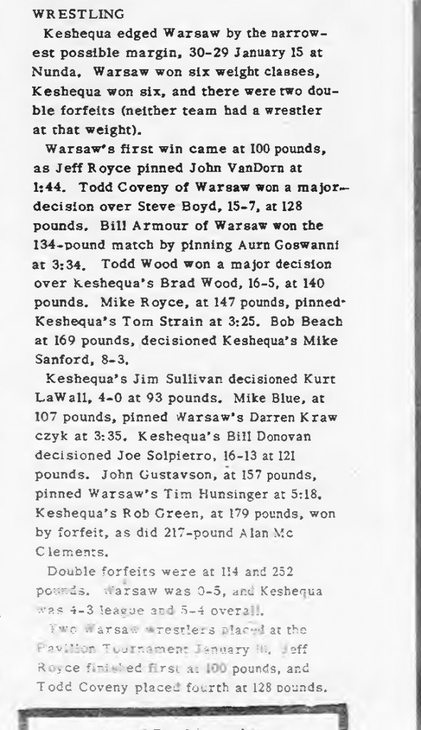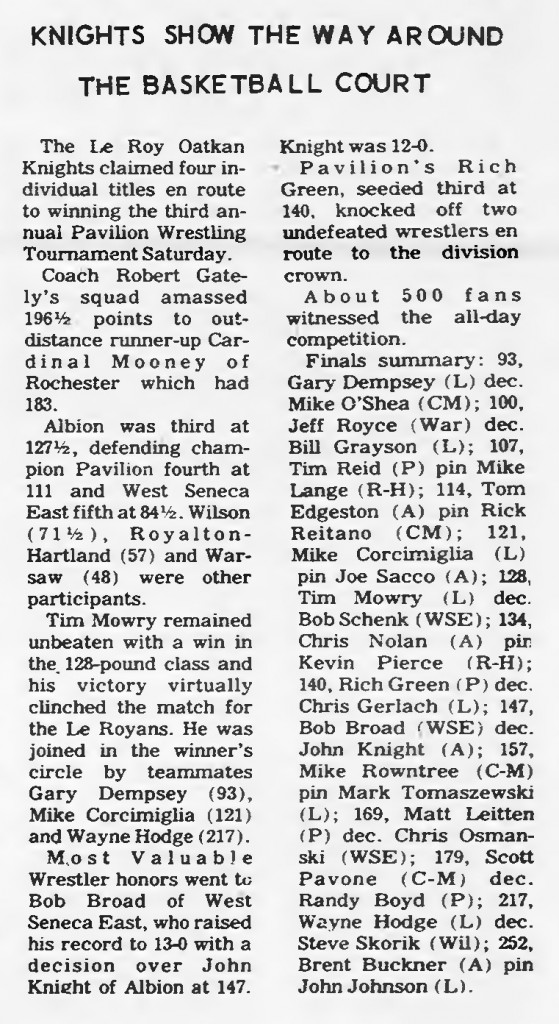 Le Roy [NY] 196.5, Cardinal Mooney [NY] 183, Albion [NY] 127.5, Pavilion [NY] 111, West Seneca East [NY] 84.5, Warsaw [NY] 71.5, Wilson [NY] 71.5, Royalton-Hartland [NY] 57