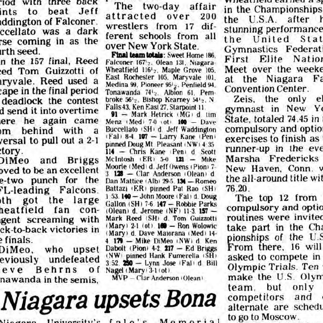 Sweet Home [NY] 186, Falconer [NY] 167.5, Olean [NY] 131, Niagara Wheatfield [NY] 116.5, East Rochester [NY] 105, Maple Grove [NY] 105, Maryvale [NY] 101, Medina [NY] 99, Pioneer [NY] 95.5, Penfield [NY] 94, Tonawanda [NY] 74.5, Albion [NY] 61, Pembroke [NY] 56.5, Bishop Kearney [NY] 54.5, Niagara Falls [NY] 43, Kenmore East [NY] 27, Starpoint [NY] 11