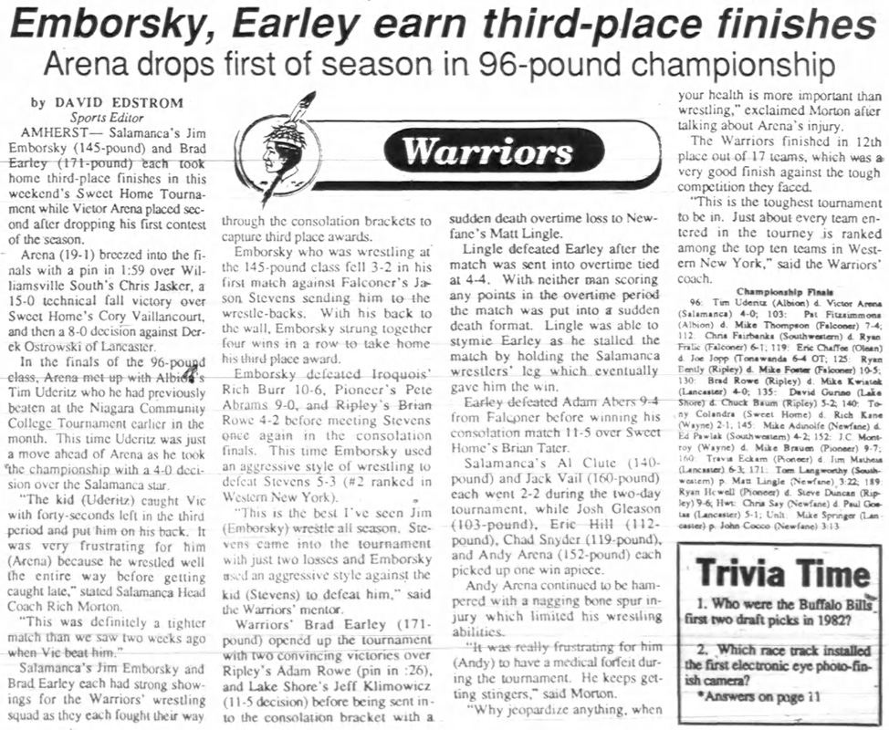 Jim Emborsky (Salamanca) > Jason Stevens (Falconer) decision 5-3