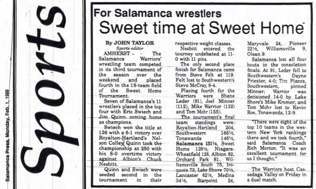 Tim Piazza (Southwestern) > Joel Minner (Salamanca) fall 4:11