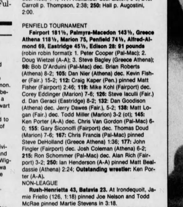 Mike Kohl (Fairport) > Cory Eddinger (Marion) decision 7-6
