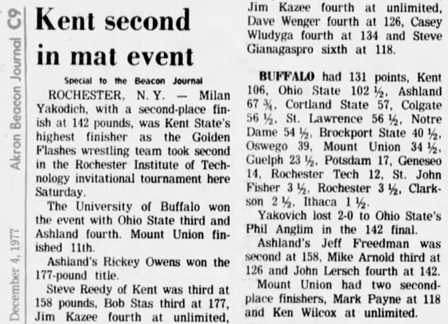 University at Buffalo [NY] 131, Kent State University [OH] 106, Ohio State University [OH] 102.25, Ashland University [OH] 71.75, SUNY Cortland [NY] 57, Colgate University [NY] 56.5, St. Lawrence University [NY] 56.5, University of Notre Dame [IN] 54.5, SUNY Brockport [NY] 40.5, SUNY Oswego [NY] 39, Mount Union College [OH] 34.5, University of Guelph [ON] 23.25, SUNY Potsdam [NY] 17, SUNY Geneseo [NY] 14, Rochester Institute of Technology [NY] 12, St. John Fisher College [NY] 3.5, University of Rochester [NY] 3.5, Clarkson College of Technology [NY] 2.5, Ithaca College [NY] 1.5