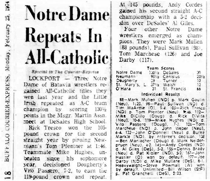 Batavia Notre Dame [NY] 130.5, Bishop Neumann [NY] 90.5, Cardinal Dougherty [NY] 39.5, St. Mary's of Lancaster [NY] 37.5, Cardinal O'Hara [NY] 33, Lockport DeSales [NY] 27.5, Canisius [NY] 18.5, Archbishop Walsh [NY] 12, Bishop Turner [NY] 12, St. Francis [NY] 6