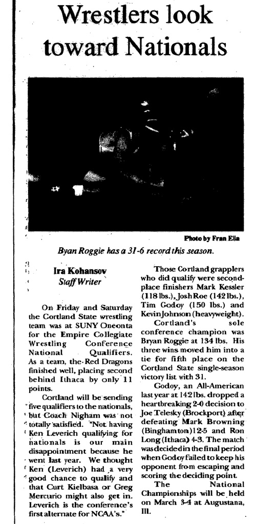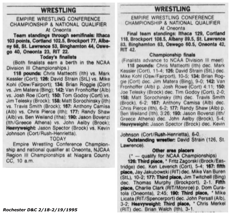 Fritz Zagorski (Brockport) > Ken Leverich (Cortland) decision 5-4