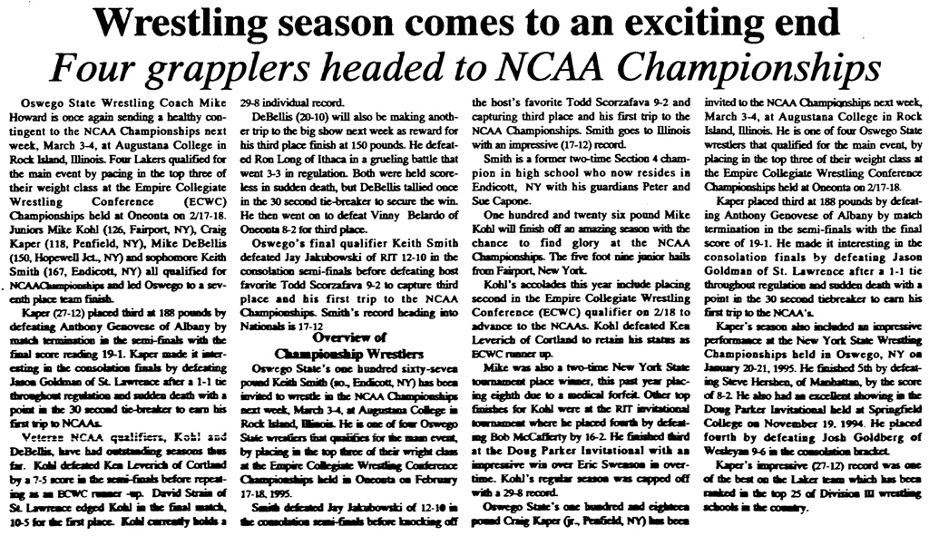 Mike DeBellis (Oswego) > Vinny Belardo (Oneonta) decision 8-2
