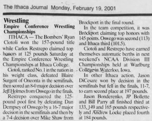 Ryan Ciotoli (IC) > Jeff Holmes (Oswego) major decision 8-0