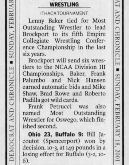 Frank Petrucci (Oswego) > Kris Harrington (Brockport) SV 6-4 (1OT)
