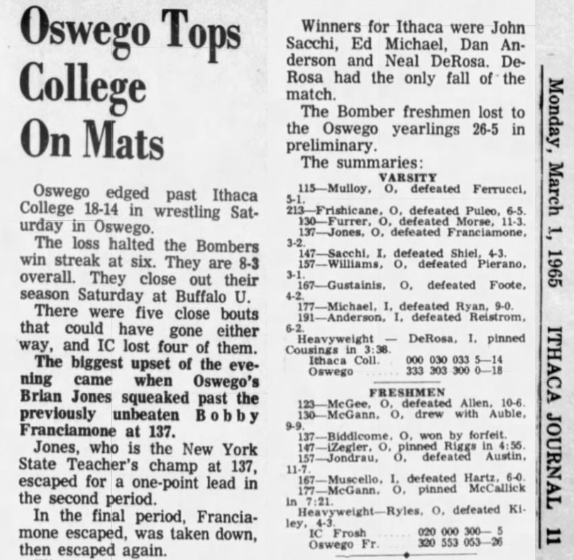 Neil DeRosa (IC) > William Cousins (Oswego) fall 3:36