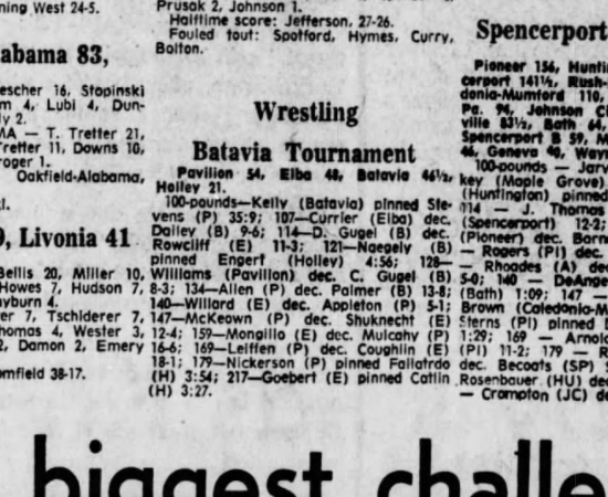 Pavilion [NY] 54, Elba [NY] 48, Batavia [NY] 46.5, Holley [NY] 21