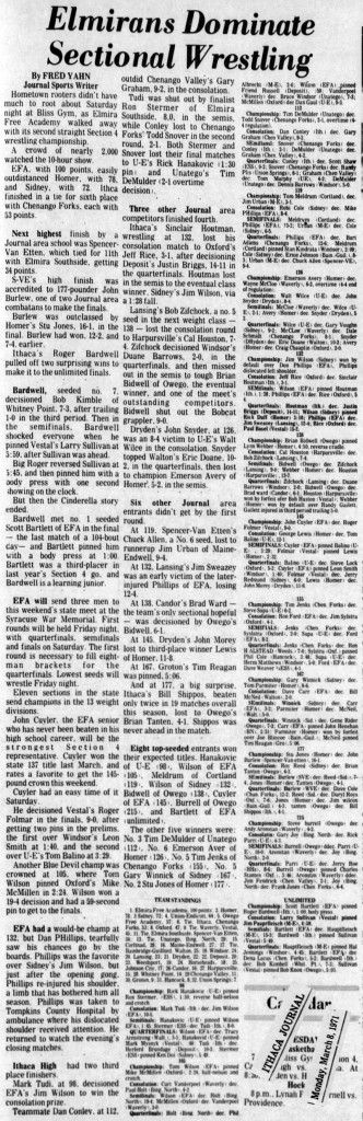 Elmira Free Academy [NY] 100, Homer [NY] 78, Sidney [NY] 72, Union-Endicott [NY] 64, Owego [NY] 57, Chenango Forks [NY] 53, Ithaca [NY] 53, Oxford [NY] 47, Vestal [NY] 45, Waverly [NY] 45, Elmira Southside [NY] 34, Spencer-Van Etten [NY] 34, Binghamton North [NY] 29, Unatego [NY] 29, Cortland [NY] 28, Maine-Endwell [NY] 27, Bainbridge-Guilford [NY] 25, Walton [NY] 25, Windsor [NY] 24, Lansing [NY] 23, Dryden [NY] 22, Deposit [NY] 20, Weedsport [NY] 19, Horseheads [NY] 18, Johnson City [NY] 17, Candor [NY] 16, Harpursville [NY] 15, Whitney Point [NY] 14, Chenango Valley [NY] 11, Groton [NY] 9, Hancock [NY] 8, Union Springs [NY] 7