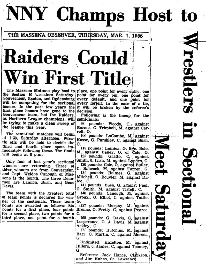 Massena [NY] 62, Gouverneur [NY] 47, Canton [NY] 39, Ogdensburg Free Academy [NY] 27