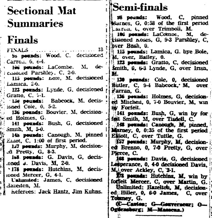 Jim Bole (Massena) > George Lamica (Gouverneur) decision 2-0