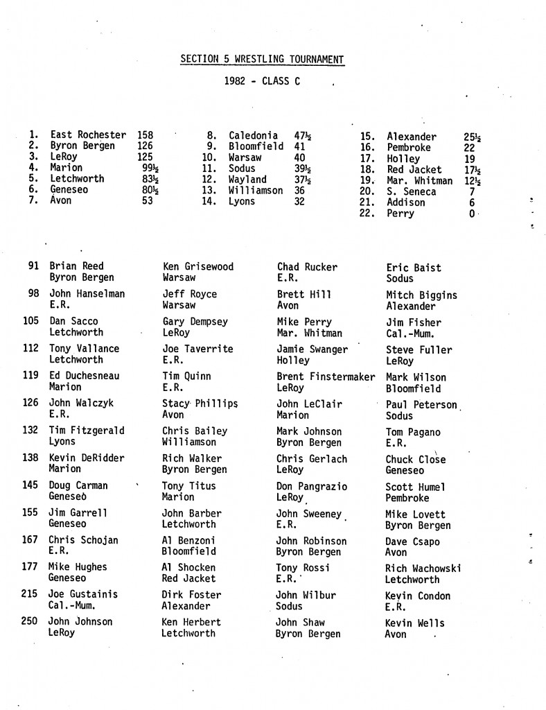 East Rochester [NY] 158, Byron-Bergen [NY] 126, Le Roy [NY] 125, Marion [NY] 99.5, Letchworth [NY] 83.5, Geneseo [NY] 80.5, Avon [NY] 53, Caledonia-Mumford [NY] 44.5, Bloomfield [NY] 41, Warsaw [NY] 40, Sodus [NY] 39.5, Wayland [NY] 37.5, Williamson [NY] 36, Lyons [NY] 32, Alexander [NY] 25.5, Pembroke [NY] 22, Holley [NY] 19, Red Jacket [NY] 17.5, Marcus Whitman [NY] 12.5, South Seneca [NY] 7, Addison [NY] 6,