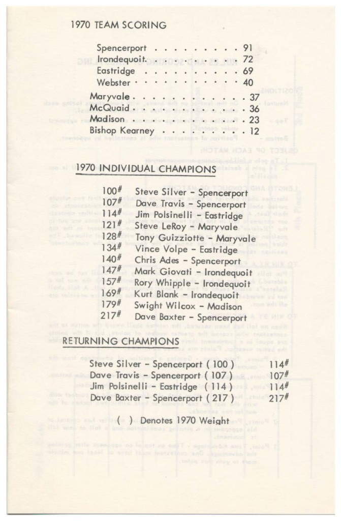 East Irondequoit Eastridge [NY] 94, Churchville-Chili [NY] 85, Spencerport [NY] 65.5, Madison (Rochester) [NY] 38, Bishop Kearney [NY] 37, McQuaid Jesuit [NY] 28, Webster [NY] 22.5, Edison Tech (Rochester) [NY] 11