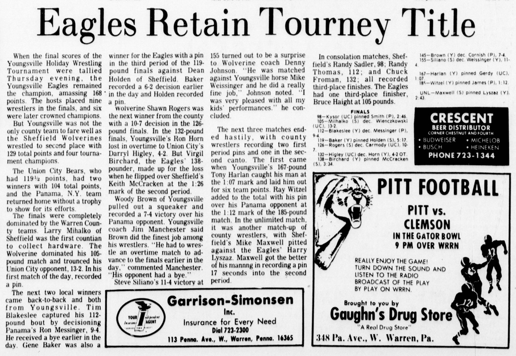 Youngsville [PA] 168, Sheffield [PA] 129, Union City [PA] 119.5, Panama [NY] 104