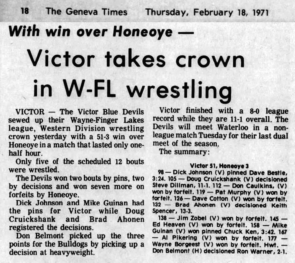 Doug Cruikshank (Victor) > Steve Dillman (Honeoye) major decision 11-1