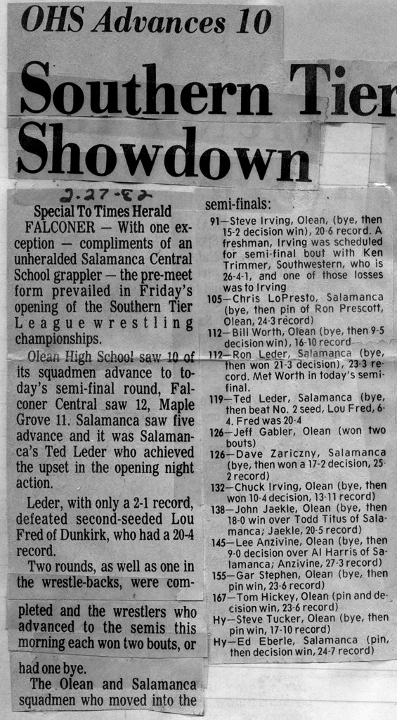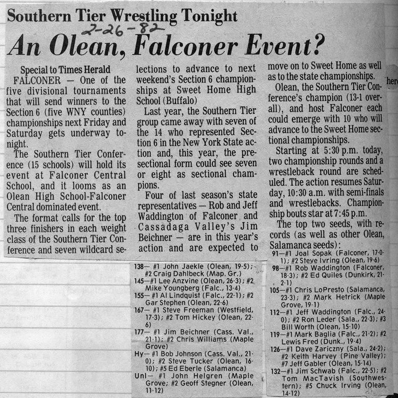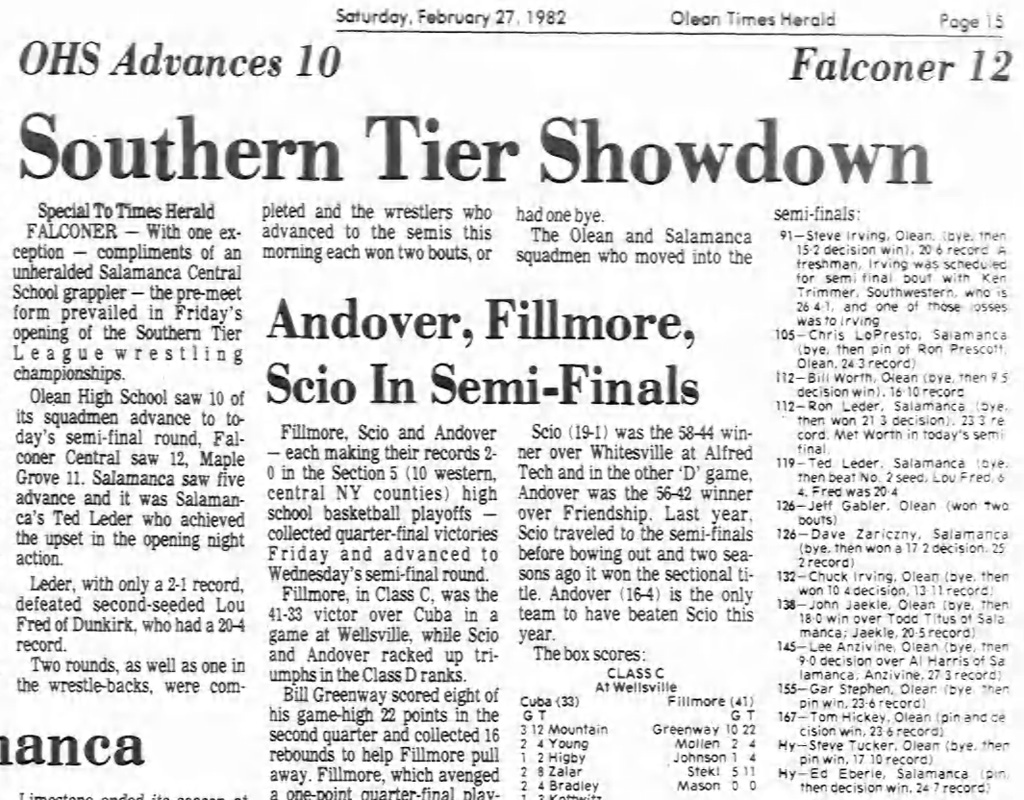 Steve Irving (Olean) > Joel Sopak (Falconer) decision 1-0