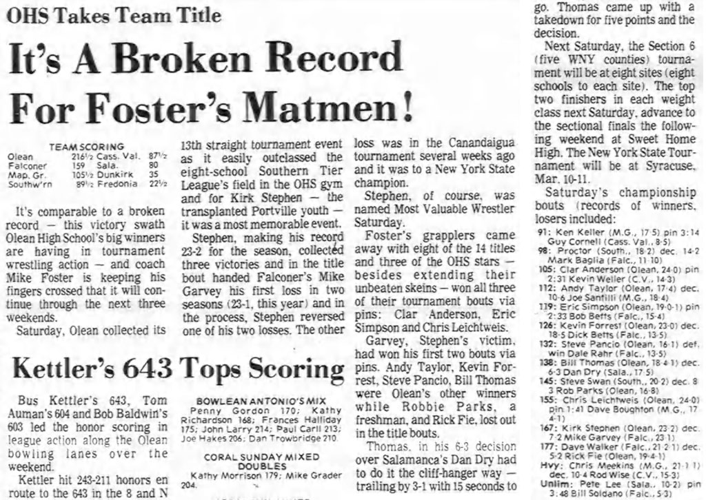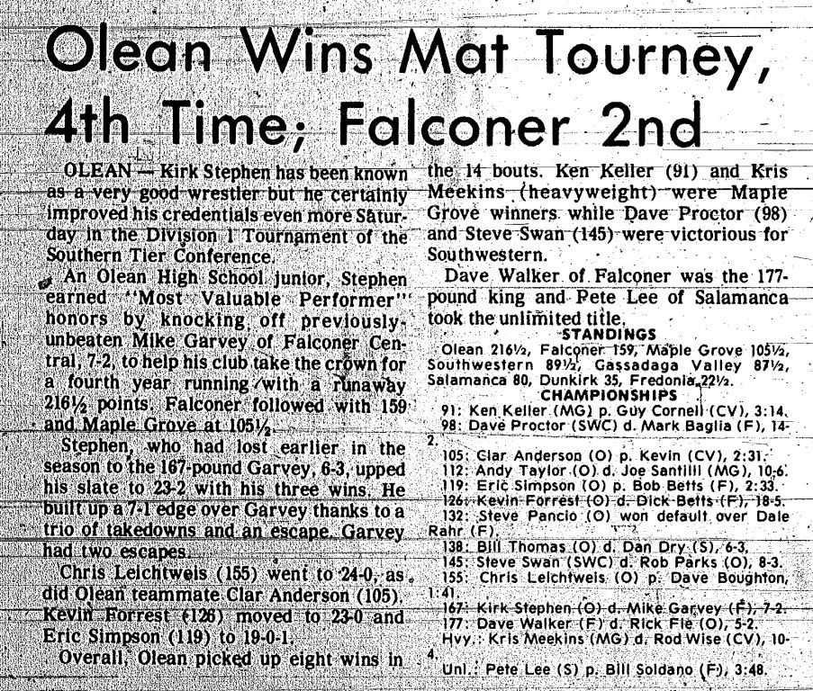 Kirk Stephen (Olean) > Mike Garvey (Falconer) decision 7-2