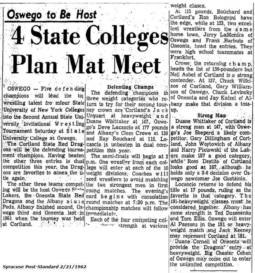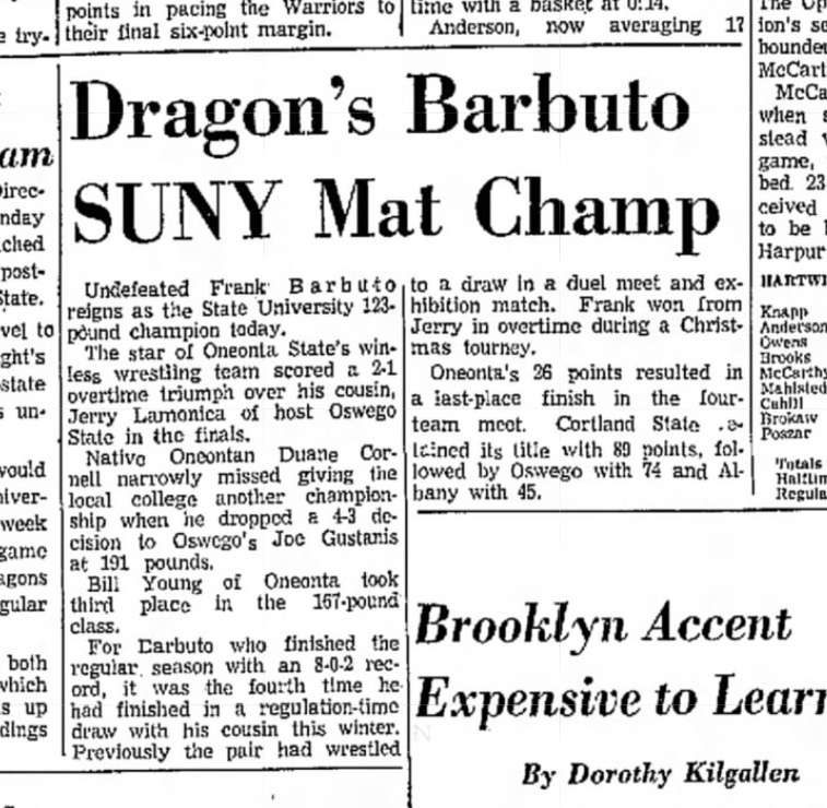 Frank Barbuto (Oneonta) > Jerry LaMonica (Oswego) decision 2-1 (1OT)
