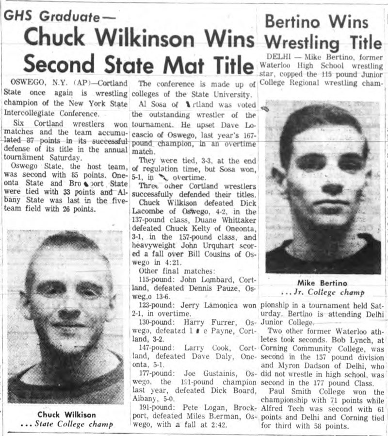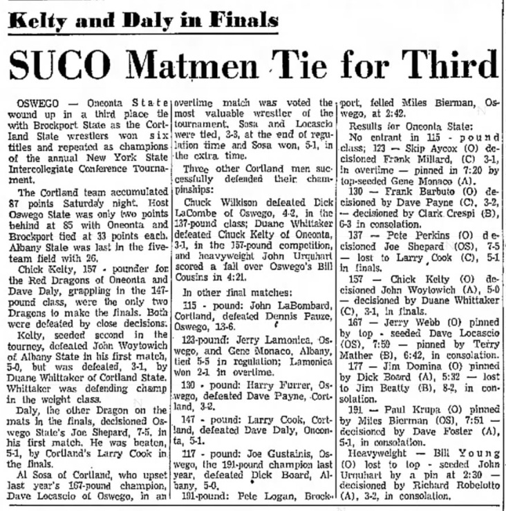 Harry Furrer (Oswego) > Dave Payne (Cortland) decision 3-2